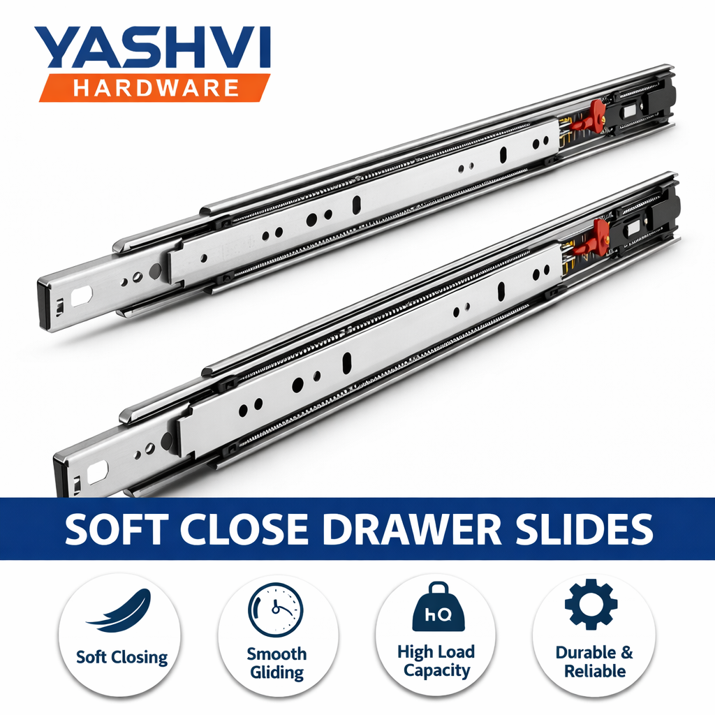 This full extension soft close drawer slide ensures smooth and silent drawer movement. Built with strong steel ball bearings for durability and high load capacity. Ideal for kitchen drawers and office furniture.